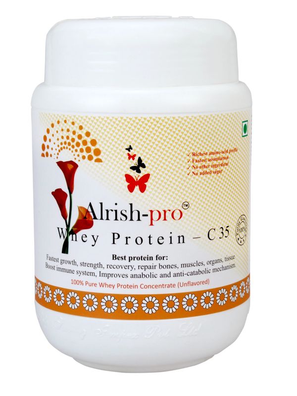 Alrish-Pro C-35 is a high-quality whey protein concentrate produced by Alish Life Saving Impex Pvt. Ltd. It contains 35% non-denatured whey protein, derived from cow’s milk, and is free from acid-treated whey. The product is instantized and agglomerated to enhance absorption and bioavailability, ensuring it mixes easily with water, milk, or juice without clumping.